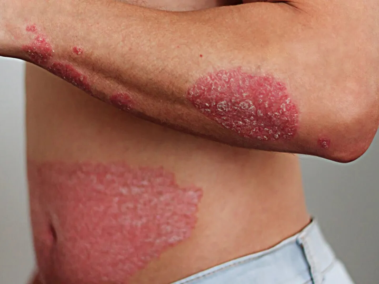 Plaque-Psoriasis ist die am häufigsten vorkommende Form. Es zeigt sich als rote, schuppende Haut, oft bei Ellenbogen, Knien und Kopfhaut.
